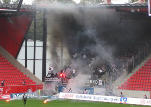 In der Regionalliga Bayern kam es am Samstag zum Ostbayern Derby zwischen Jahn Regensburg und Wacker Burghausen. Beide Fanlager zeigten eine Choreografie und die Gästefans machten zudem noch mit einer Pyroshow auf sich aufmerksam, die nun für Diskussionen sorgt.