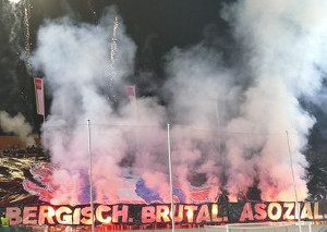 Die Ultras Wuppertal feierten beim gestrigen Heimspiel des Wuppertaler SV gegen Fortuna Düsseldorf II ihren 15. Geburtstag nach und zeigten gleich zwei Choreografien auf der Horst-Szymaniak-Tribüne, die beide mit reichlich Pyrotechnik bzw. Feuerwerk unterlegt wurden.